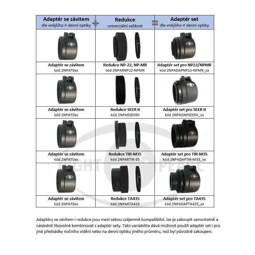 - Redukce SEER II - v univerzální velikosti (pokud potřebujete na denní optiku uchytit i jiný předsádkový systém, než je termovizní předsádka SEER - např. noční vidění Night Pearl NP-22, zakupte samostatné redukce pro vybrané přístroje)